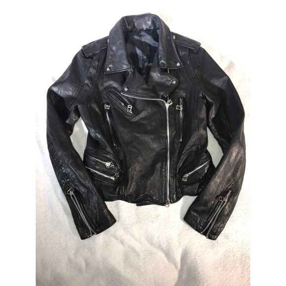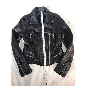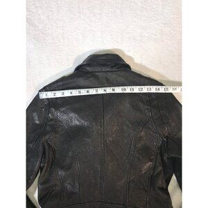This Women's Black Leather Asian Styled Y2K Moto Jacket by Unknown Source is a stylish statement piece. Made of high-quality leather, it reflects the Y2K aesthetic in a chic, modern way. Boasts unique raised textured silver toned studs and zipper accents!