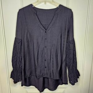 Womens Black Tuxedo Eyelet Long Puff Sleeve Hi-Low Button Up Tunic Blouse M