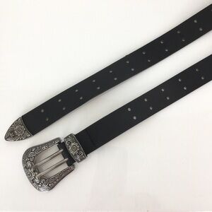 Women’s Black Vegan Leather Western Belt Antique Silver Floral Buckle Size M