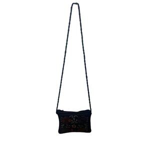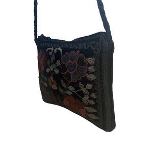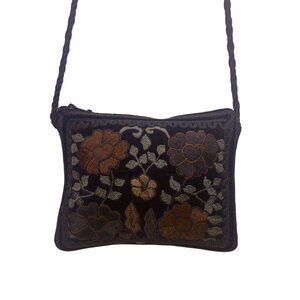 Compact crossbody bag with floral embroidery, velvet texture, braided strap, and secure zipper. Lightweight and elegant for carrying small essentials.
