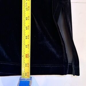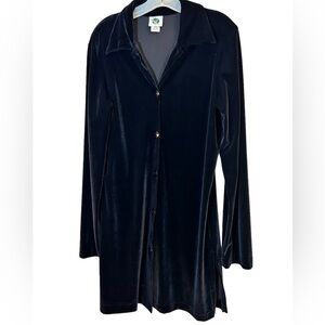 In very good, preowned condition. Would be really cute with leggings and boots, or open over a top with jeans. All kinds of ways to wear black velvet.