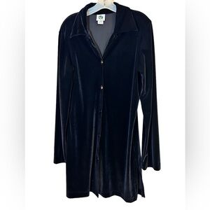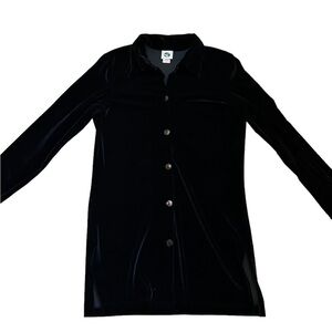 A great, easy to wear, soft black velvet tunic/blouse. Collar, button front and cuffs, side slits.