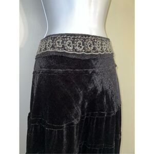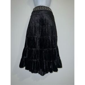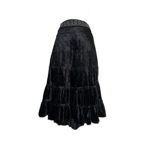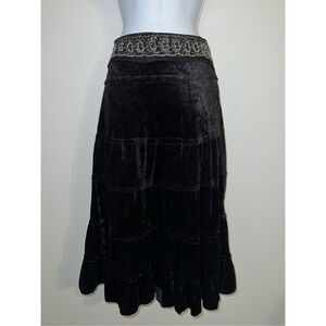 Women’s Black Velvet Whimsy Midi Celestial Skirt SMALL. Beaded waist, side zipper. Tiered velvet.