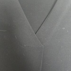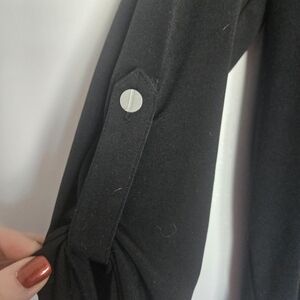 Elegant black blouse with front pleat and V neck. Button detail on mid arm. Features a sleek design for a modern look.