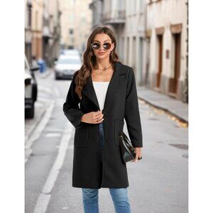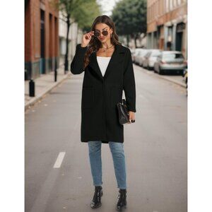 Women's Black Winter Wool Blend Coat Notch Lapel Mid Long Breasted Pea Coat J