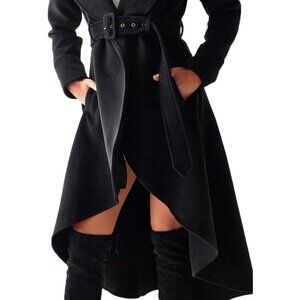 Women's Black Winter Wool Wrap Large Collar High Low Jacket Outwear Trench Coat