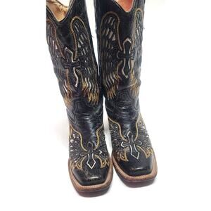 Step out in style with these chic black and brown heeled boots. Perfect for any occasion.