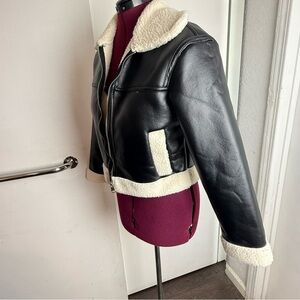 Elevate your style with this chic black and cream shearling jacket. Perfect for any occasion, this jacket offers both warmth and elegance.
