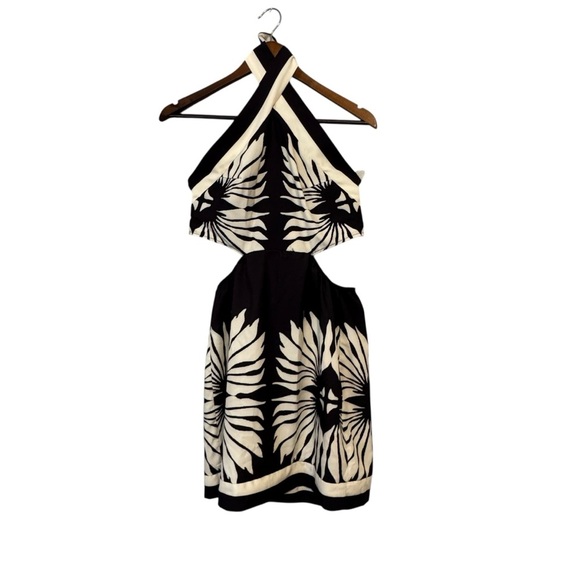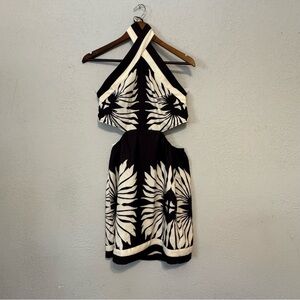 Women's Black and Cream Tropical Halter Mini Cutout Dress