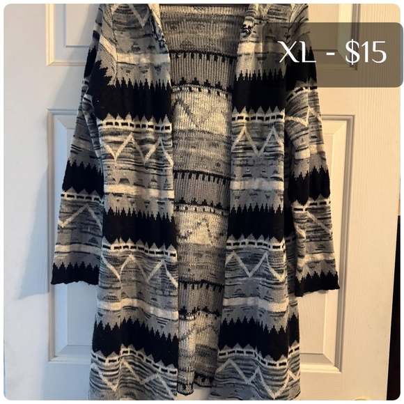 Stay cozy and stylish with this black and gray patterned long hooded cardigan. Perfect for layering and adding a touch of elegance to your wardrobe.