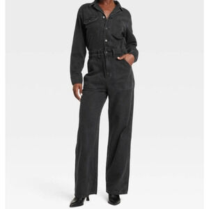 This women's black size 14 long sleeve Chore Denim Coveralls jumpsuit by Universal Thread is perfect for a grunge skater look. Made from a comfortable cotton blend fabric with a relaxed fit, this one-piece features a collared neckline, button closure, and straight leg style. The 29-inch inseam makes it suitable for winter, fall, and spring seasons. Easy to care for with machine washable instructions, this jumpsuit is ideal for travel, casual, or workwear occasions.