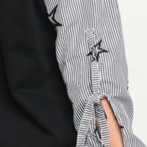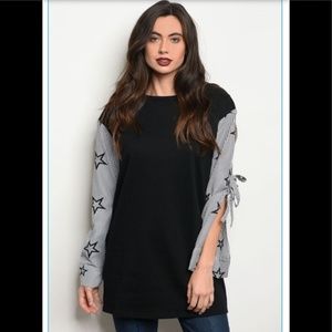 NEW WITH TAGS This womens black top with star sleeves is a size medium. Buttons at the wrist and ties at the elbow. Made of 100% Cotton. The fabric has a little stretch and is a thicker material like sweatsuit material. Very comfortable and warm. Measurements are 31 inches from shoulder to bottom, 21 inches armpit to armpit, and 23 inch sleeves.