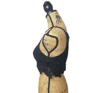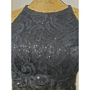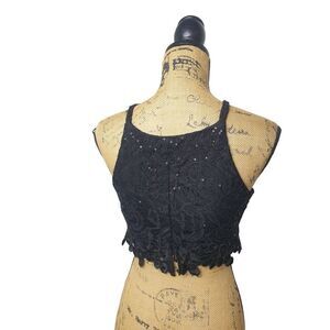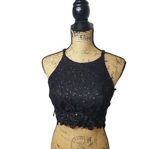 Women's Black Lace Sequin Halter Sz 5 Glamcore Top Floral Hem Festival Y2K