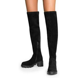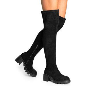 Women's Black-suede Faux Leather Knee High Over The Knee High Chunky Heel Boots