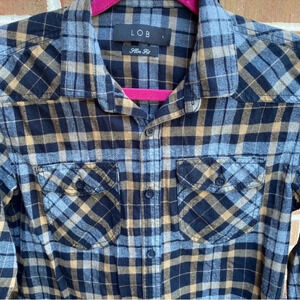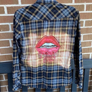 Women’s Bleached LOB Red Lip Graphic Blue & Brown Plaid Flannel-Size Medium