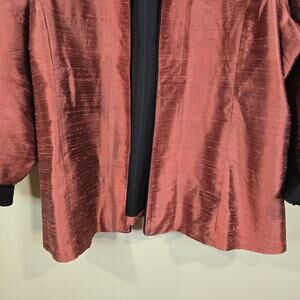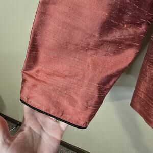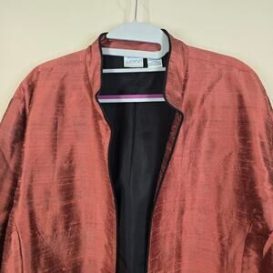 Excellent condition, women's Bleu Bayou copperish red shimmer, silk, open front blazer/jacket. This is lined and does not have pockets. This material doesn't stretch. Dry clean only.