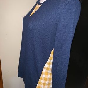 Navy top with a yellow and white checkered back. Cute with jeans. Excellent used condition.