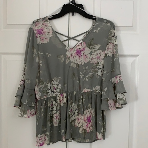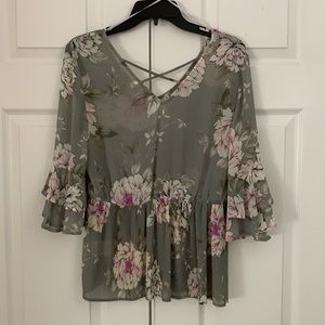 Love and Piece women’s blouse. Gray with white, pink, lavender flower design. Straps in back as shown. Ruffle half sleeves. Size medium. New without tags.