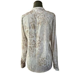 Discover the chic CALVIN KLEIN Women’s Blouse, a stylish #animalprint shirt perfect for any wardrobe. Crafted from 100% polyester, this #chiffon blouse features a flattering V-neckline and #longsleeves measuring 25". The shirt boasts convenient front pockets and trendy shoulder epaulets, adding a touch of sophistication. With a full length of 27" and a chest measurement of 20" from a/pit to a/pit, this size S blouse fits comfortably and stylishly. The blouse comes in a classy #tan and #beige #leopardprint pattern that's sure to make a statement. Enjoy the versatility of convertible sleeves, allowing you to switch up your style with ease. This piece is in very good condition, ready to enhance your fashion collection. #CALVINKLEIN #womensfashion #vneck #chicstyle #fashiontop #trendytop #wardrobeessentials
