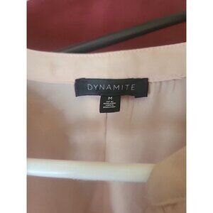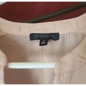 This vintage Dynamite brand blouse is a must-have for any 1990s business occasion. The long-sleeved, sheer material adds a touch of elegance to your outfit, while the beige color complements any skin tone. The shirt style and secretary/geek look make it perfect for any workplace or vintage clothing enthusiast.