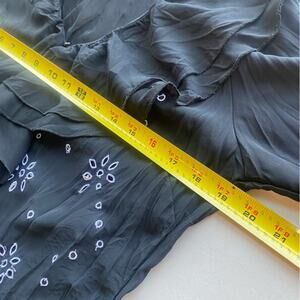 Size Medium. Approximate measurements shown are 26” long sleeves, 19” pit to pit laid flat. 10” deep v-neck. Good used condition. No rips or stains. The ruffles show a little wear on the fabric.
