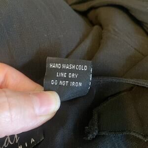 Women’s crinkle sheer lightweight black blouse w/ruffles & eyelet lace flowers. Long sleeve. Buttons all the way down. Buttons are hidden. Bell sleeves.