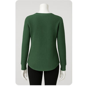 This is a women's long-sleeve Henley top in a dark green, ribbed knit fabric. It features a round neckline with a four-button placket at the front. The sleeves are full-length with ribbed cuffs. The hemline is curved, appearing slightly longer at the sides. The garment is displayed on a mannequin and shows no visible imperfections or branding.