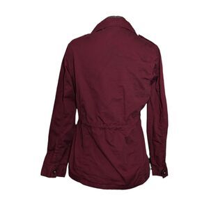 Women's Blue Age Red Mid-Length Distressed Denim Jacket, Size Medium. Red, burgundy color. Two buttoned bottom pockets. Two faux zipper pockets at the top. Fully button-down with a tie cord at the waist. Distressing on top front. Lightweight denim, 100% cotton. Excellent condition, no flaws or wear.