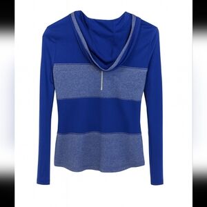 It's a women's size medium with long sleeves and a pullover design with a short zipper at the neck for adjustable coverage. The attached hood provides extra protection from the elements. This versatile piece is in great condition and ready for its new owner. Grab it now and elevate your athletic style!