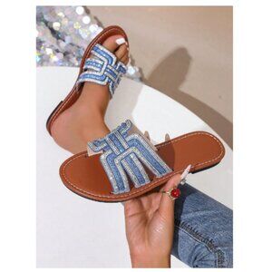 Women's Blue Beaded Slide Sandals - Open Toe Casual Flats - Size 6.5