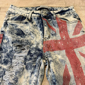 These pre-owned Blue Connection women's jeans, size 5/6, feature an acid wash blue denim with a distressed finish, including rips on the front legs. A prominent red Union Jack flag design is printed across the front and back of both legs. The jeans have a button and zipper closure, along with traditional front and back pockets.