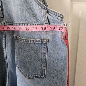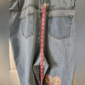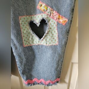 Stylish women's denim overalls featuring vibrant patches. Perfect for a casual, trendy look. Well loved and Reworked