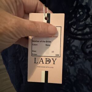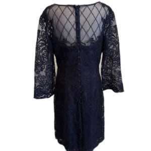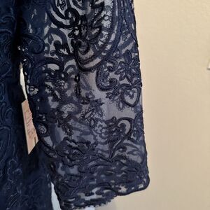 Beautiful navy blue dress with beading. Has a mesh upper and button accents down the zipper in back. Perfect for mother of the bride or other formal occasions. Come with earrings.