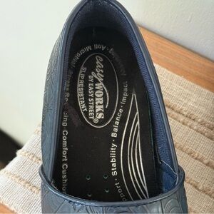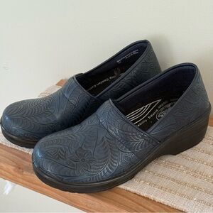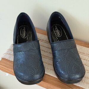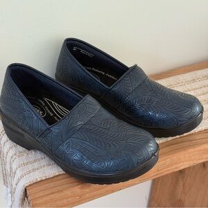 Women's Blue Embossed Mules Easy Works By Lyndee Slip Resistant Clogs