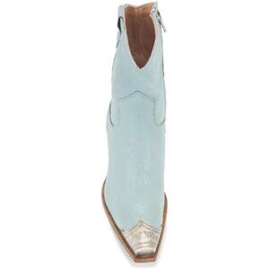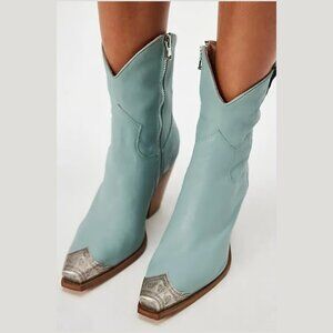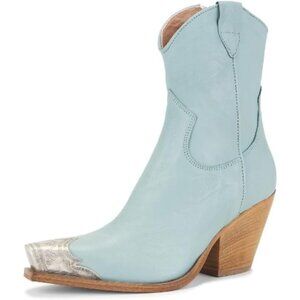 Women's Blue Faux Leather Steel Toe Side Zipper Block Heel Western Ankle Boots