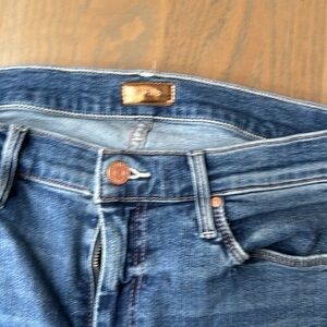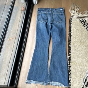 Stylish and comfortable women's flared jeans in classic blue. So so comfy. Very stretchy. Inseam is: 30". Full length jeans. 10" rise. Fitted through hips and thighs.