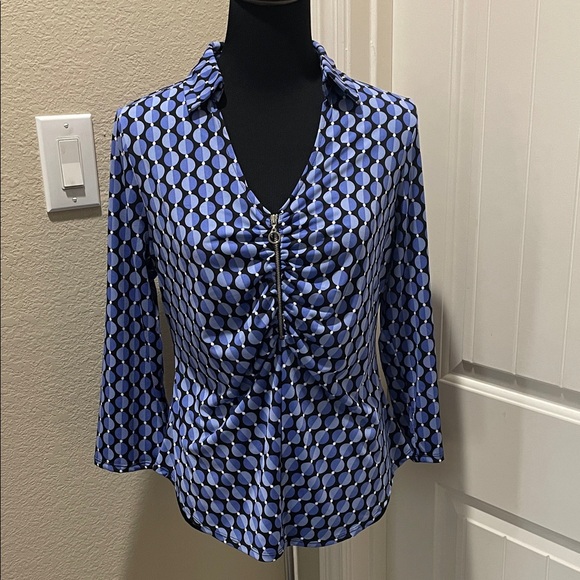 Stylish blue geometric print top with ruched front detail. Lightweight, soft fabric for comfortable all-day wear. Long sleeves and a classic collar create a polished look. Versatile blue color pairs easily with skirts or trousers.