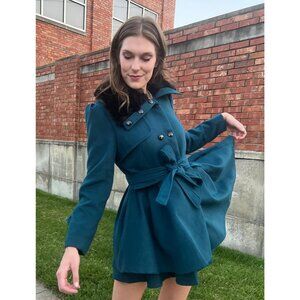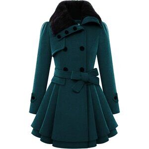 Women's Blue Green Zeagoo Winter Trench Coat Faux Fur Lapel Double Breasted
