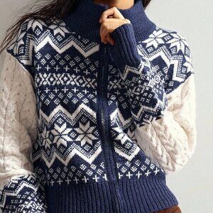 Blue And White Casual Women's Boho Fair Isle Snow Geometric Print Pattern Zip-Up sweater