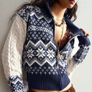 Blue And White Casual Women's Boho Fair Isle Snow Geometric Print Pattern Zip-Up sweater