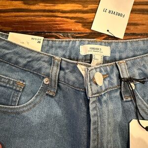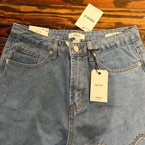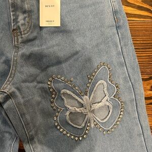 New with tags. Stylish women's blue jeans featuring a unique butterfly design. Perfect for casual outings. Add a touch of elegance to your wardrobe. Forever 21 size 28
