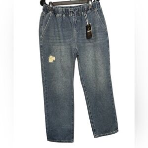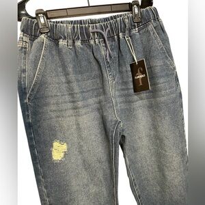 Women’s blue jeans with a comfortable fit. Distressed in front. Elastic waist with drawstring, front and back pockets.