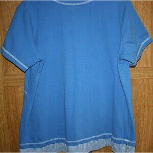 Women's All American Comfort Pull over top in blue. Short sleeves with stripe trim at neck and on bottom. Good used condition. No rips. Approximate measurements:
