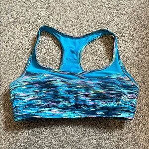 Stay comfortable and stylish with this blue patterned sports bra. Perfect for workouts or casual wear.