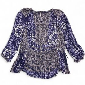 Free People Women's Boho Ratio Indigo Printed Button Down Tunic Blouse size Medium