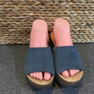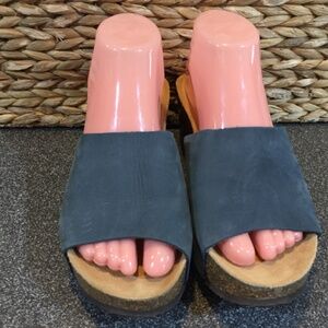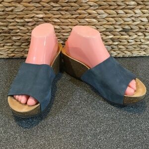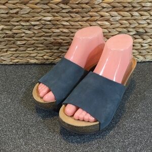 Step out in style with these chic Bio Bio blue platform wedge leather and cork sandals. Perfect for any occasion.