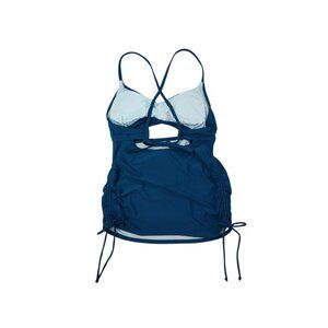 Women's Blue Ruched Tankini with Crisscross Straps and Side Ties, Size M.