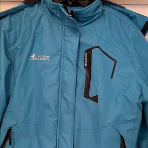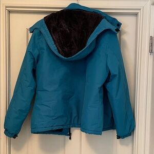 Stay warm and stylish on the slopes with this blue ski and snow jacket. Designed for comfort and performance. Size XL, removable hood, zip inside pocket, zip chest pocket, 2 front zip pockets, faux fur lined, waterproof and wind resistant, no rips or stains