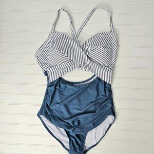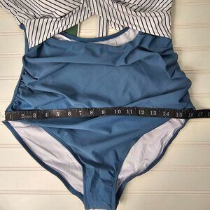 Women's Blue Striped Wrap Top Cut Out High Waist One Piece Swimsuit Size XL NWT