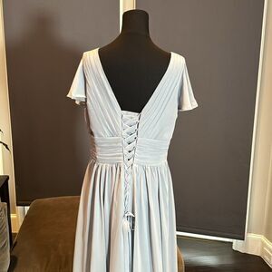 Women’s Blue/Gray Full Length Chiffon Dress with Flutter Sleeves and a Corset Back.